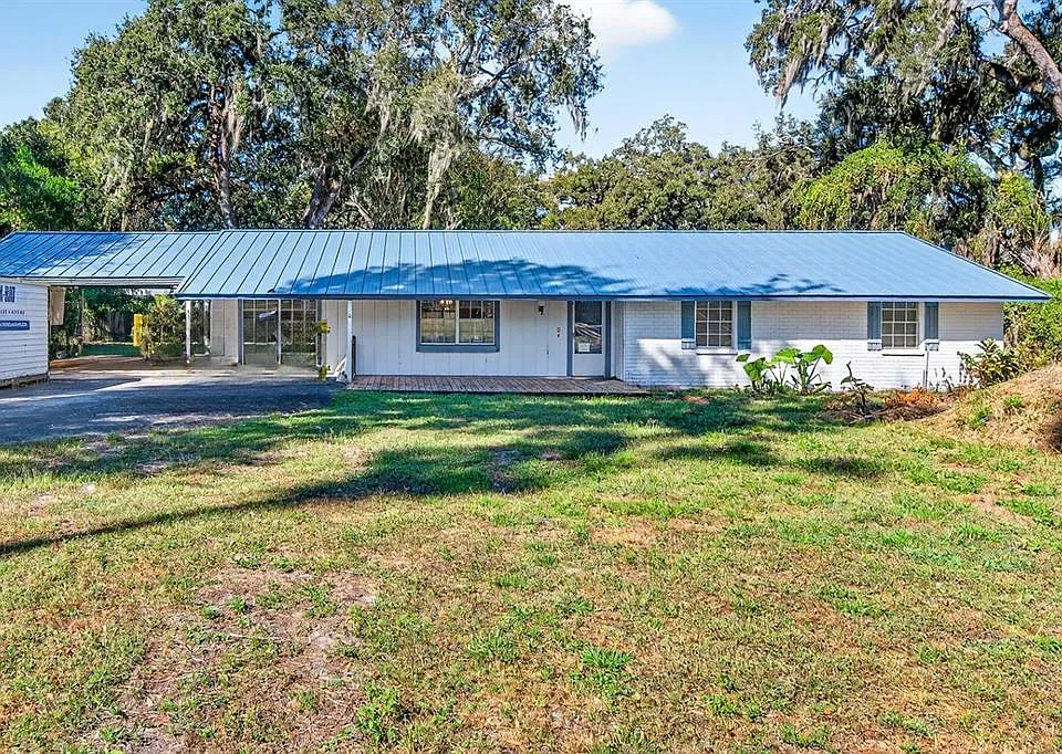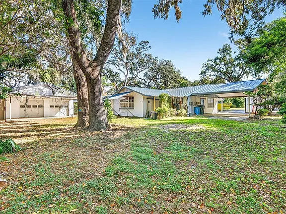 One or more photo(s) has been virtually staged. Welcome to this charming ranch-style home, perfectly situated on just under half an acre with no deed restrictions or HOA fees! Featuring 4 bedrooms, 2.5 baths, and a massive detached garage with water, electric, and multiple workshops, this property is ideal for hobbyists, mechanics, or anyone who loves extra space to create and build. Step through the front door into a welcoming foyer that opens to a bright and airy living area. The dining room, accented by warm wood floors, sits conveniently off the kitchen—perfect for family gatherings and entertaining guests. The spacious kitchen offers abundant cabinet and counter space, along with a peninsula island and breakfast bar for casual dining and conversation. The family room impresses with vaulted ceilings, gleaming wood floors, a large bay window, and elegant wood French doors that fill the space with natural light. The French doors open to an enclosed room—ideal as a mudroom connecting the main home to the workshop area—and lead to an expansive Florida room with soaring ceilings and endless potential for entertaining, a game room, or an additional living area. All bedrooms are generously sized, offering flexible layouts to suit your needs. A separate den provides a cozy retreat for reading, relaxing, or even converting into a 4th bedroom, complete with its own exterior entry. The indoor utility room includes a washer and dryer, wash sink, and extra storage. The detached 925 sq ft garage is a standout feature, offering a two-car bay, half bath, a large 24’ x 15’ workshop, and an 18’ x 8’ office—all equipped with water, electric, and air conditioning. There’s also covered storage along the side and back of the garage, plus a long paved driveway and two-car carport for ample parking. Conveniently located near I-75 and I-4, this solidly built home offers easy access to Tampa, Brandon, and surrounding areas. With plenty of space, functionality, and room to customize, this property is ready to become your forever home.