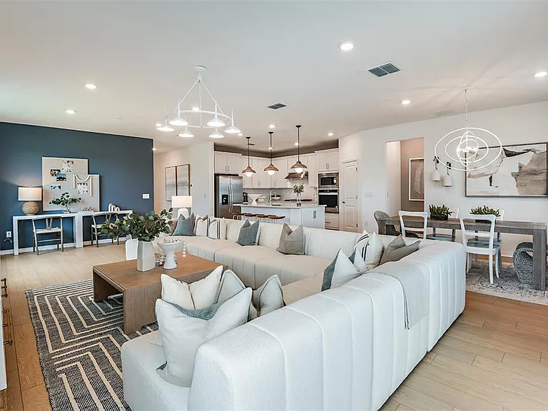 Under Construction. Pulte is selling in Evergreen! Conveniently located near I-75 and I-4, enjoy an easy commute to Downtown Tampa, Brandon, and Lakeland. This vibrant community features thoughtfully designed landscapes, modern home designs, quality construction, and a family-friendly environment. Discover one of the most highly-sought after suburbs of Tampa Bay, where every home seamlessly blends with Florida’s natural beauty. Featuring the popular Medina floor plan with an open-concept home design, this home has all the upgraded finishes you’ve been looking for. The designer kitchen showcases a spacious center island, white cabinets, quartz countertops with a 3″x6″ white subway tiled backsplash, Whirlpool stainless steel appliances including a dishwasher, microwave, refrigerator and range, and a large single-bowl sink. The bathrooms have matching white cabinets and quartz countertops and dual sinks, a linen closet, a walk-in shower, and a private commode in the Owner’s bath. There is luxury vinyl plank flooring int eh main living areas, 18”x18” floor tile in the baths, and laundry room and stain-resistant carpet in the bedrooms. This home makes great use of space with an upgraded 4th bedroom, a convenient laundry room with Whirlpool washer and dryer, additional storage in the HVAC closet, an oversized gathering room, a large, covered lanai, and a 2-car garage. Additional upgrades include 4 LED downlights and floor outlet in the gathering room, pendant pre-wiring in the kitchen, whole house faux wood blinds and a Smart Home technology package with a video doorbell. Enjoy peace of mind with Pulte’s transferable, 10-year Limited Structural Warranty that covers materials and workmanship in the 1st year, workability of plumbing, electrical, HVAC, and other mechanical systems through the 2nd year, various types of water infiltration and internal leaks through the 5th year, and the structural integrity of the home through the 10th year. Plus, we’re currently offering limited-time incentives and below-market rates!