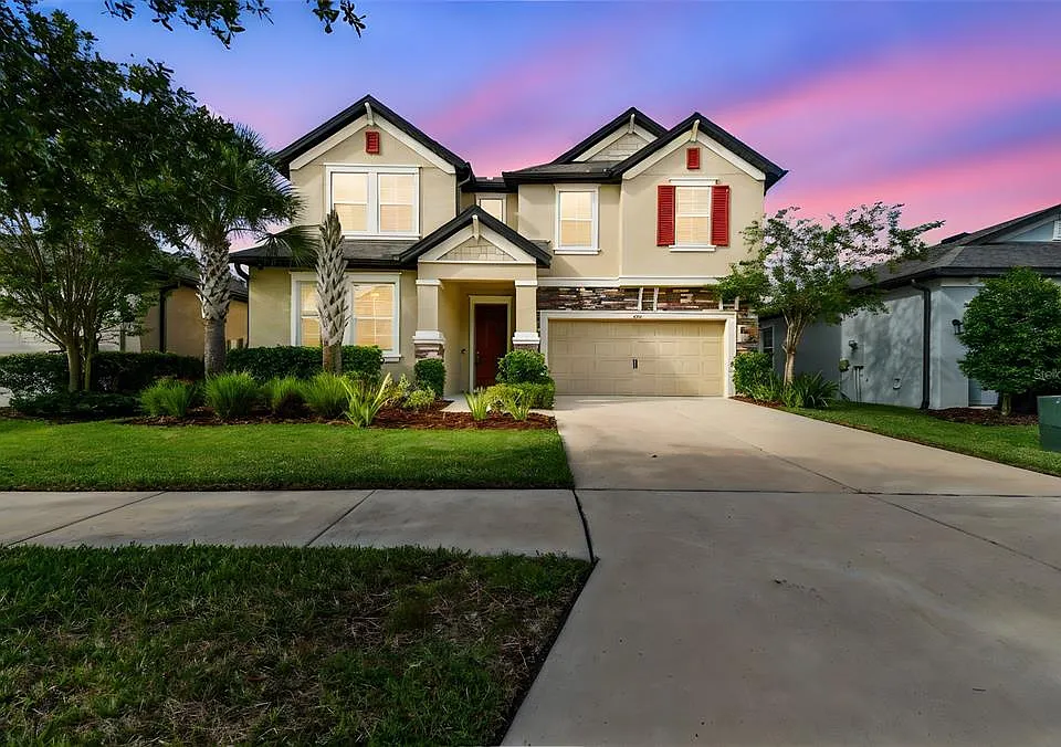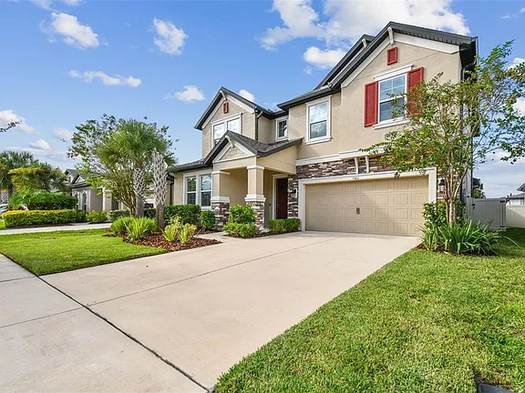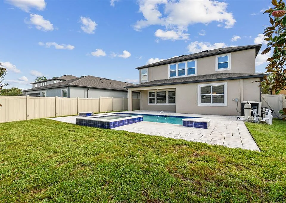 Nestled in the gated community of Wesbridge, this stunning 3BR/2.5BA pool home with a flex room, loft, and 2-car garage combines elegance and functionality. The open floor plan features soaring ceilings, a sun-filled living area, and a gourmet kitchen with granite countertops, stainless steel appliances, wall-mounted oven and microwave, glass cooktop, modern backsplash, and an expansive island with deep basin sink. Upstairs, a spacious loft, convenient laundry, and all bedrooms await, including the luxurious primary suite with dual vanities, walk-in shower, and large walk-in closet. Step outside to your private retreat with a covered patio, resort-style pool and spa with water features, and a fully fenced backyard with paver deck. Community amenities include a luxury pool, playground and dog park. Ideally located near I-75, SR 54, and Curley Road, offering quick access to downtown Tampa, Gulf beaches, shopping, dining, and more.